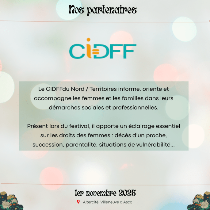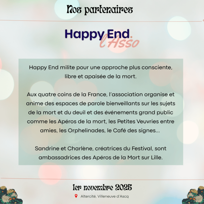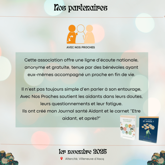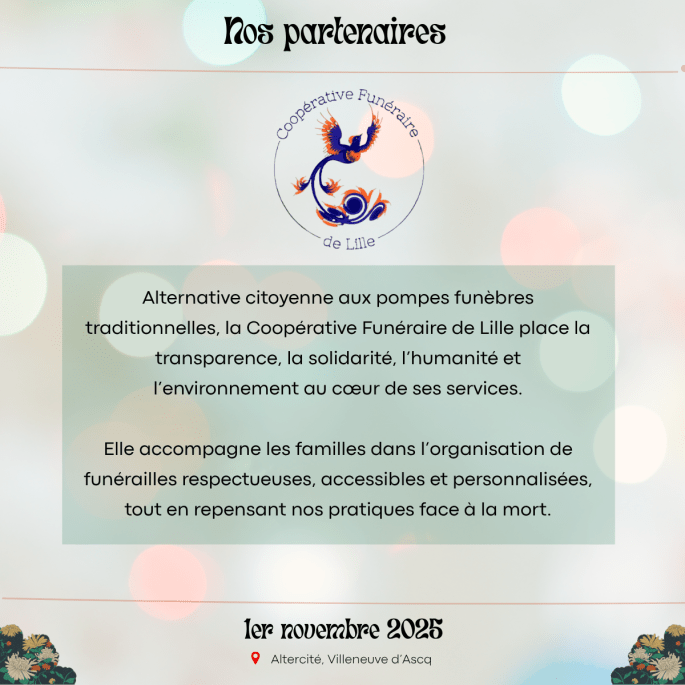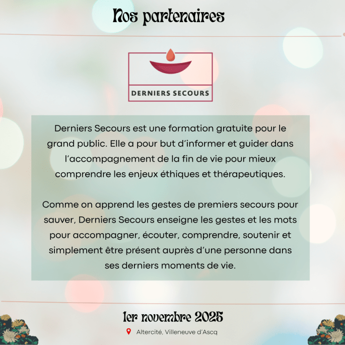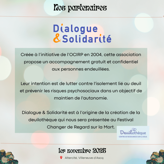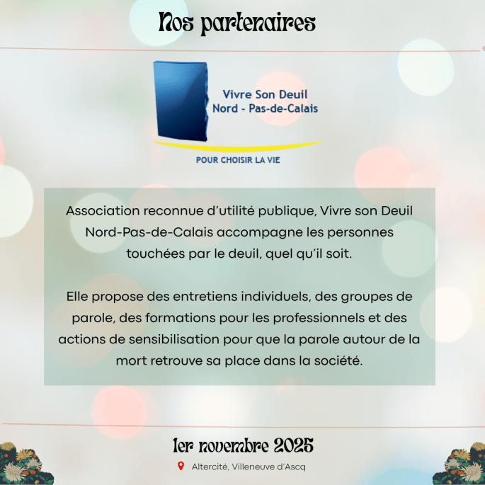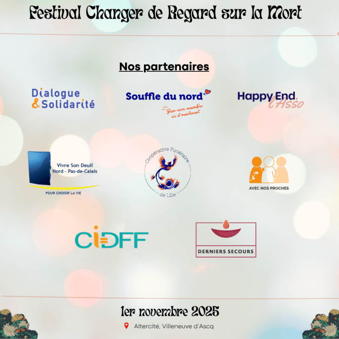 Merci à nos partenaires : DIALOGUE ET SOLIDARITE – Happy End l’Asso – VIVRE SON DEUIL NORD PAS DE CALAIS – Coopérative Funéraire de Lille – Avec Nos Proches – Derniers Secours France – CIDFF Nord/Territoires – OCIRP – Engagés pour l’autonomie !