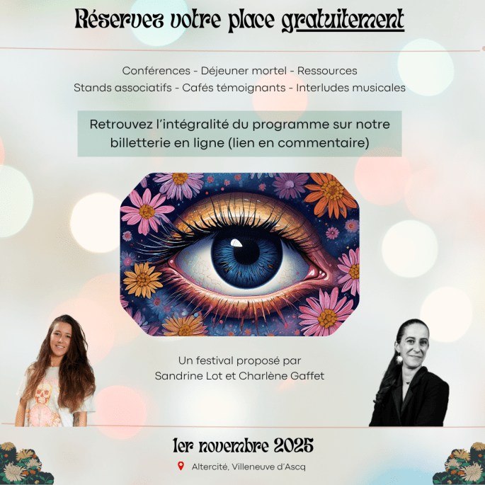 C’est une journée de ressources, de compréhension et de partage d’expériences, loin des clichés, des peurs et des discours figés où toutes les émotions seront les bienvenues, où la psychologie, la pairaidance, l’art, la philosophie, les rituels et la transmission seront de la partie pour aborder la mort autrement.