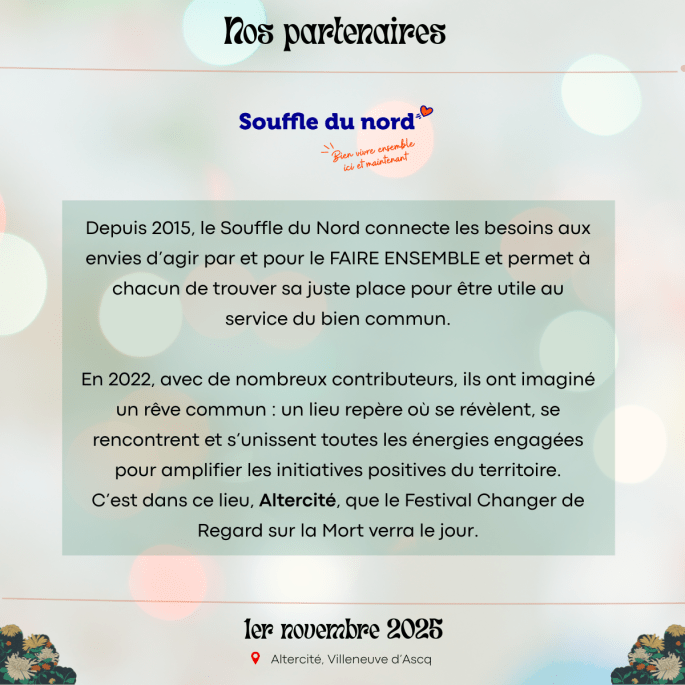 Pour cela, nous avons créé le Festival Changer de regard sur la Mort qui aura lieu le samedi 1er novembre au Souffle du Nord à Marcq-en-Baroeul.