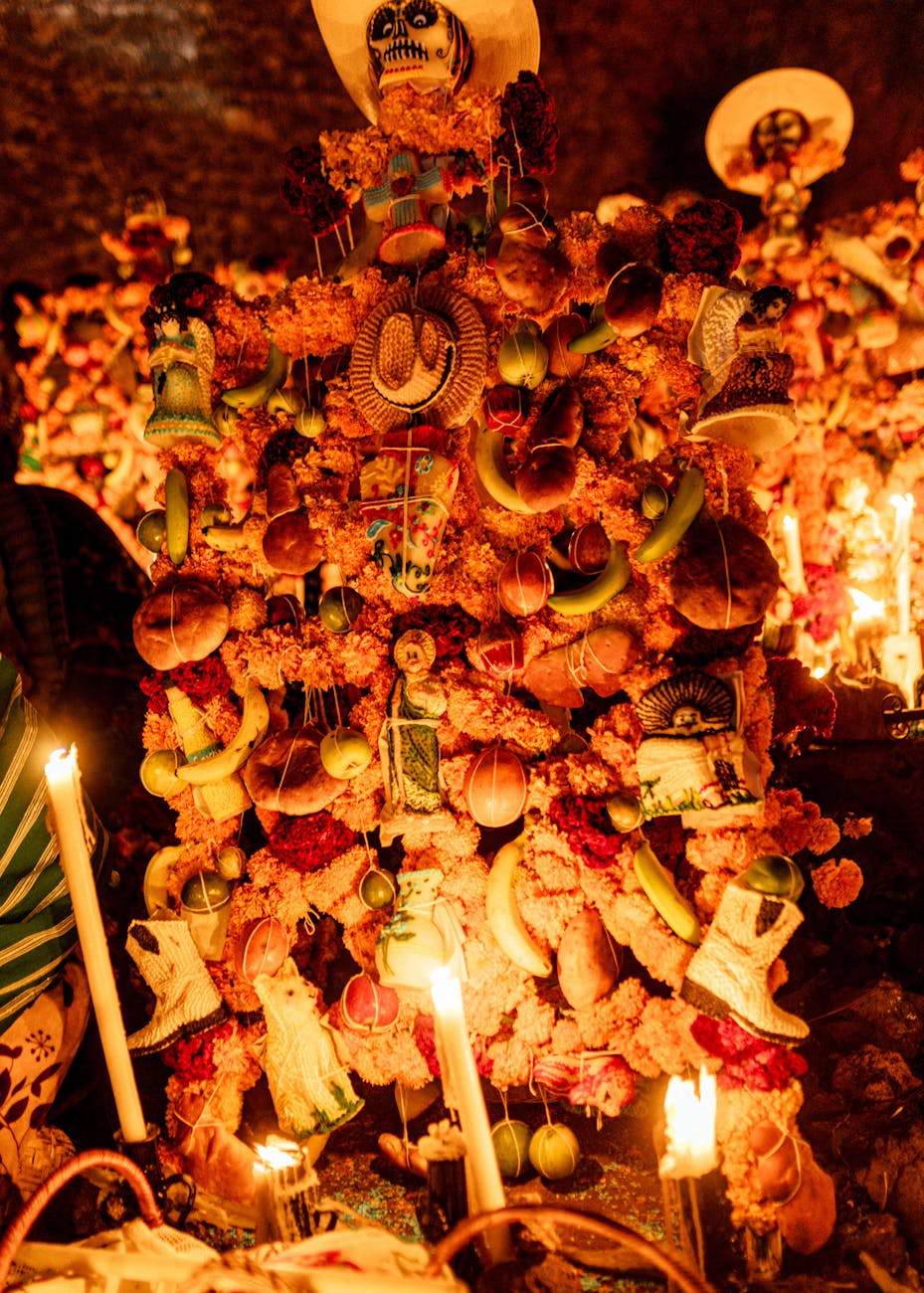 Chaque 1er et 2 novembre, les familles installent chez elles un autel coloré — ofrenda — pour accueillir les âmes de leurs proches disparus. On y dépose des bougies, des fleurs de cempasúchil (souci mexicain), des photos, des mets favoris du défunt, parfois même un peu de tequila ou de mezcal.