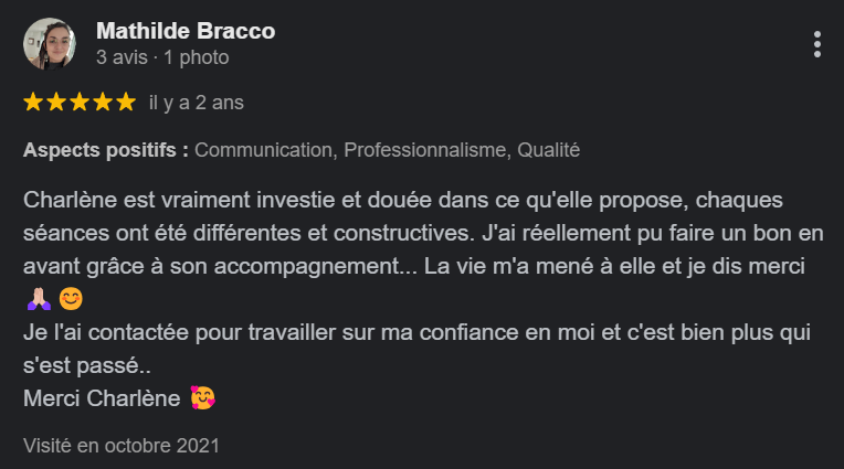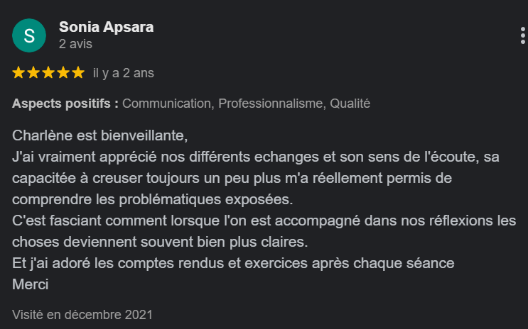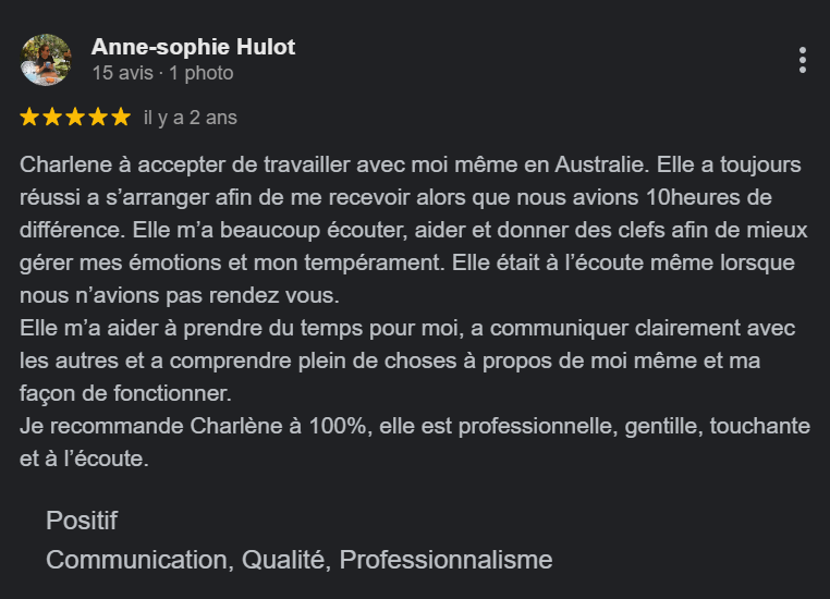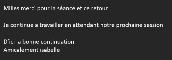 Au début de chaque séance, nous travaillons sur ce dont vous avez besoin sur le moment et sur ce que vous avez repéré comme difficultés ou questionnements depuis notre dernière entrevue.